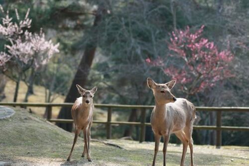 久々の奈良公園です。奈良と言えば大仏さまと鹿。 訪れた日は暖かで奈良公園にある片岡梅林まで行ってみました。 梅がふくらんで綺麗です。鹿の親子でしょうか、観光客に人気。 田舎親爺も梅と鹿、思い出の一枚撮らせてもらいました。 東大寺二月堂のお水取…